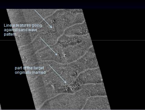 Perfectly linear shapes in nature are rare. That’s why we always hear that when someone is stranded on a deserted island, they make patterns or spell out words in the sand to indicate to aircraft that there are humans present. We apply the same theory beneath the sea, and look for things that appear unnatural in the seabed. The image below is of another likely concretion hiding some man-made object: