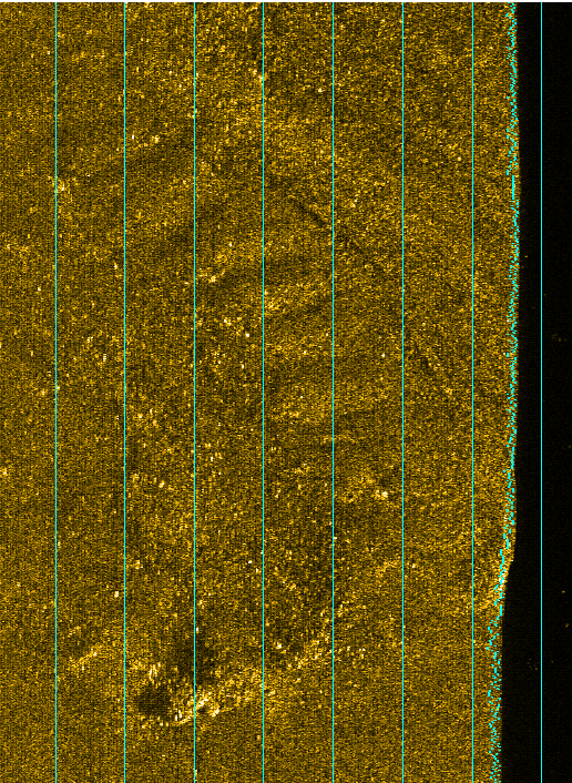 Here’s a “C” target that’s likely a couple of boulders, but still is different than the surrounding seabed.  The blue lines are 10 meters apart and we use them for measuring.