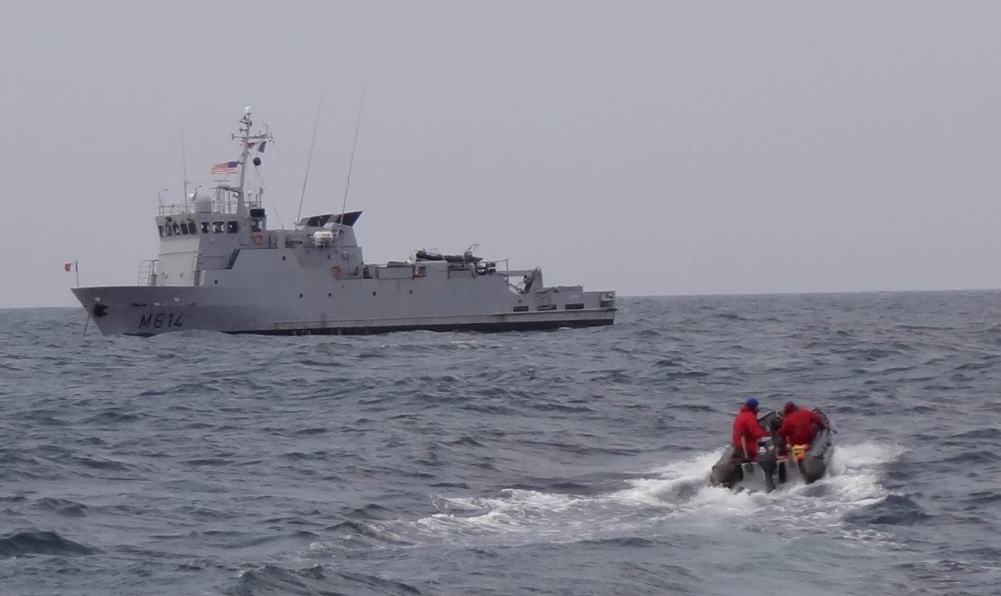 I am feeling a little bruised and battered from fighting the movements of the ship in the swells, and trying to constantly maintain balance, but not always succeeding. My daily commute is transfer by zodiac from one vessel to another in order to watch the sonar data coming in, and then going back to the other ship in the evening to see the results from diving and AUV operations. I’m getting to be an expert at putting on the bulky orange jumpsuit that’s needed for protection against cold and waves during the transfers. I continue to be impressed with the efficiency of the French Navy – launching and recovering the zodiac takes about 4 minutes, and they do it several times a day.  The divers operate out of zodiacs as well, and each dive takes 4-6 divers in the boat who each get a ten-minute dive.  It is an easier process than I thought and again, very efficient.